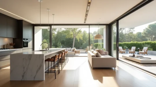 Eliminar tabiques para crear espacios abiertos tipo open space multiplica la sensación de amplitud y favorece la circulación de luz natural, pero introduce desafíos técnicos y funcionales que deben resolverse en fase de proyecto. La gestión de humos y olores procedentes de la cocina requiere sistemas de extracción potentes —campanas con motor externo de al menos 700 m³/h en cocinas integradas— y la propagación acústica obliga a incorporar materiales absorbentes estratégicamente ubicados.