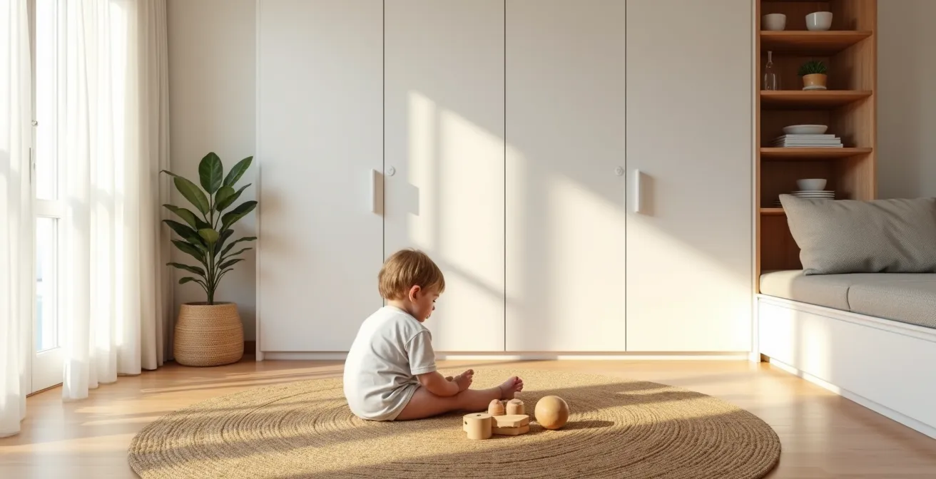 El principio fundamental del minimalismo estructural en un hogar con niños es simple: el desorden no se combate, se absorbe. La solución más eficaz no son las cestas o las cajas decorativas, sino el almacenaje invisible y masivo. Hablamos de armarios de suelo a techo, sin tiradores y pintados del mismo color que la pared. Esta estrategia transforma una necesidad funcional en un elemento arquitectónico que se mimetiza con el entorno, creando una superficie limpia y continua que esconde el caos tras una puerta.